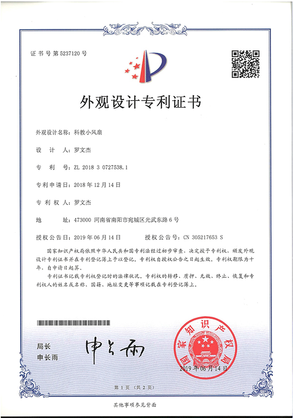 科教小風(fēng)扇外觀專利證書(shū)